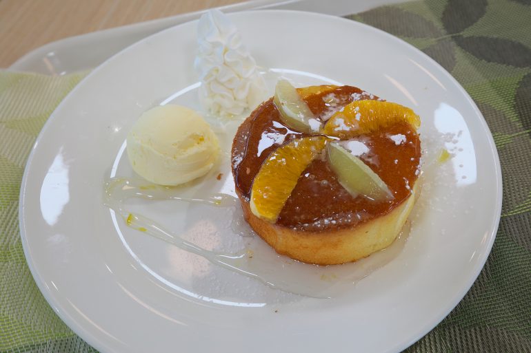 注文を受けてから揚げるたこ天は5個も入り、なるとが2枚ものっているのはウレシイ。熱々のたこ天は肉厚でプリプリ。出汁の利いたスープと柔らかめのうどんとの相性は抜群。またスフレパンケーキは地元の特産であるしまなみレモンを使い、甘さ控えめなスイーツ。運転に疲れた時のフレッシュとして食べるのに最適だ。