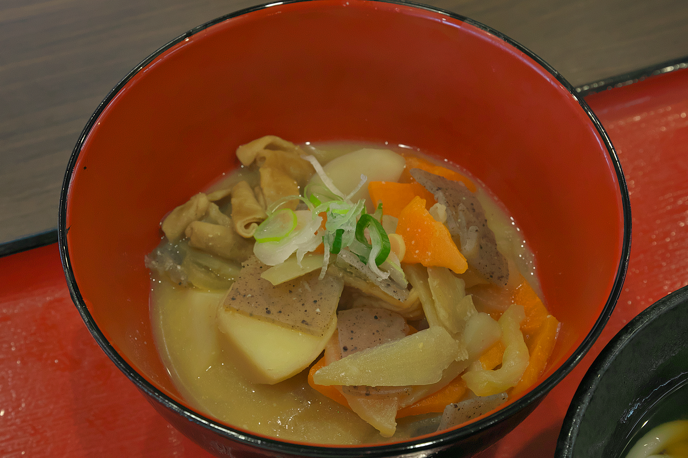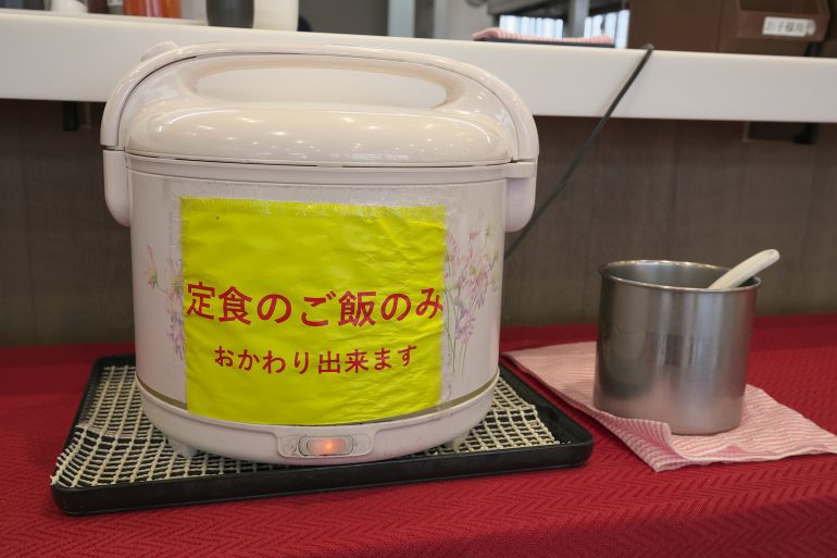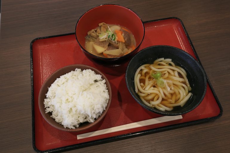 今回、愛鷹PA下りで食べたのはモツ煮定食ミニそば(うどん)セット1050円。甘めの合わせみそで仕上げたモツ煮は、豚モツをはじめ、にんじんやゴボウはしっかりと煮込まれて柔らかい。その一方で里芋はホクホクでご飯が進む。この愛鷹PA下りの愛鷹食堂の特徴は、定食メニューはごはんのおかわりが無料となっており、テーブルにおいてあるジャーで好きなだけ食べることができるのだ。かけそばもしくはかけうどんとライスそして生卵の朝定食Cは580円とリーズナブルながら、お腹いっぱい食べることができる。
