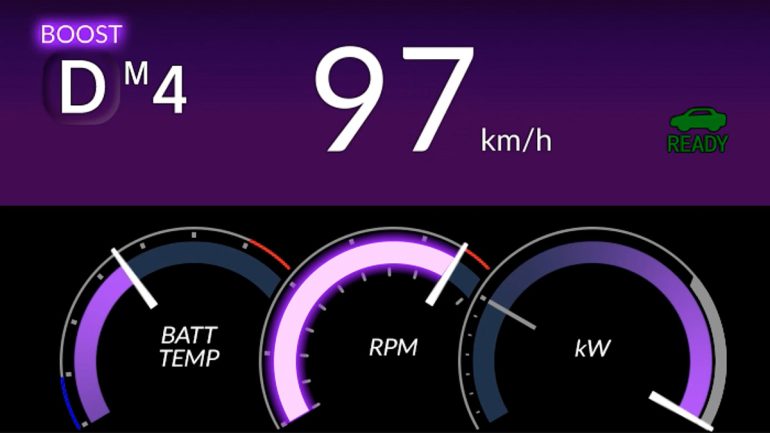 また、BOOSTモードでは、メーターとイルミネーションに専用の演出を設定した。「バッテリー温度計」「疑似タコメーター」「出力計」から構成されるデジタルのトリプルメーターは、メカニカルなアナログ計測器を彷彿とさせるデザインが採用された。疑似タコメーターは、仮想のエンジン回転数を表示し、仮想有段シフト制御と連動し、視覚的な高揚感を演出している。