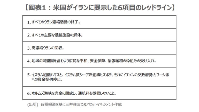 複数の報道によると、米国がイランに提示したレッドラインは、ウラン濃縮の停止やホルムズ海峡の全面開放など、6項目にわたる模様だ(図表1)。