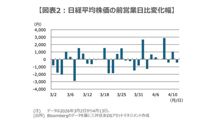 なお、日経平均株価の前営業日比の変化幅をみると、3月は下げ幅の大きさが目立ったが、4月に入ると上げ幅の大きさが目立つようになった(図表2)。