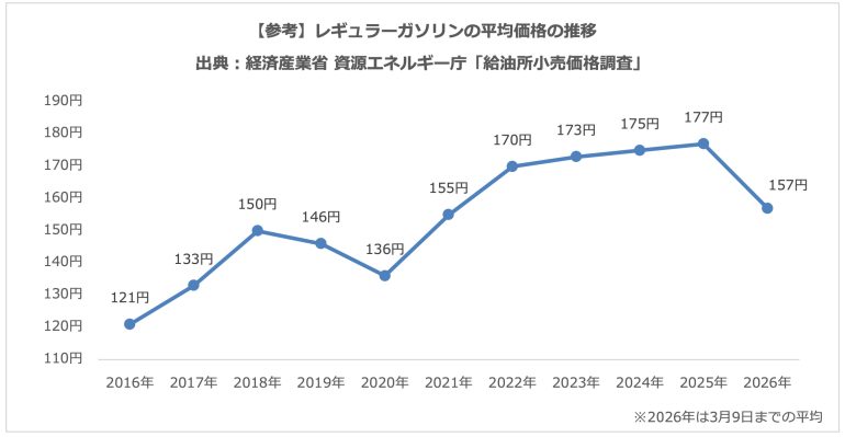 なお、昨年の調査では170円~200円以上が30%だったのに対し、今回は14%と大きく減少し、140円~160円以上を高いと捉える人が増加していた。暫定税率廃止によりガソリン価格が落ち着き、消費者の価格感覚に変化が見られる結果となった(調査期間は2026年3月2日~2026年3月10日)。
