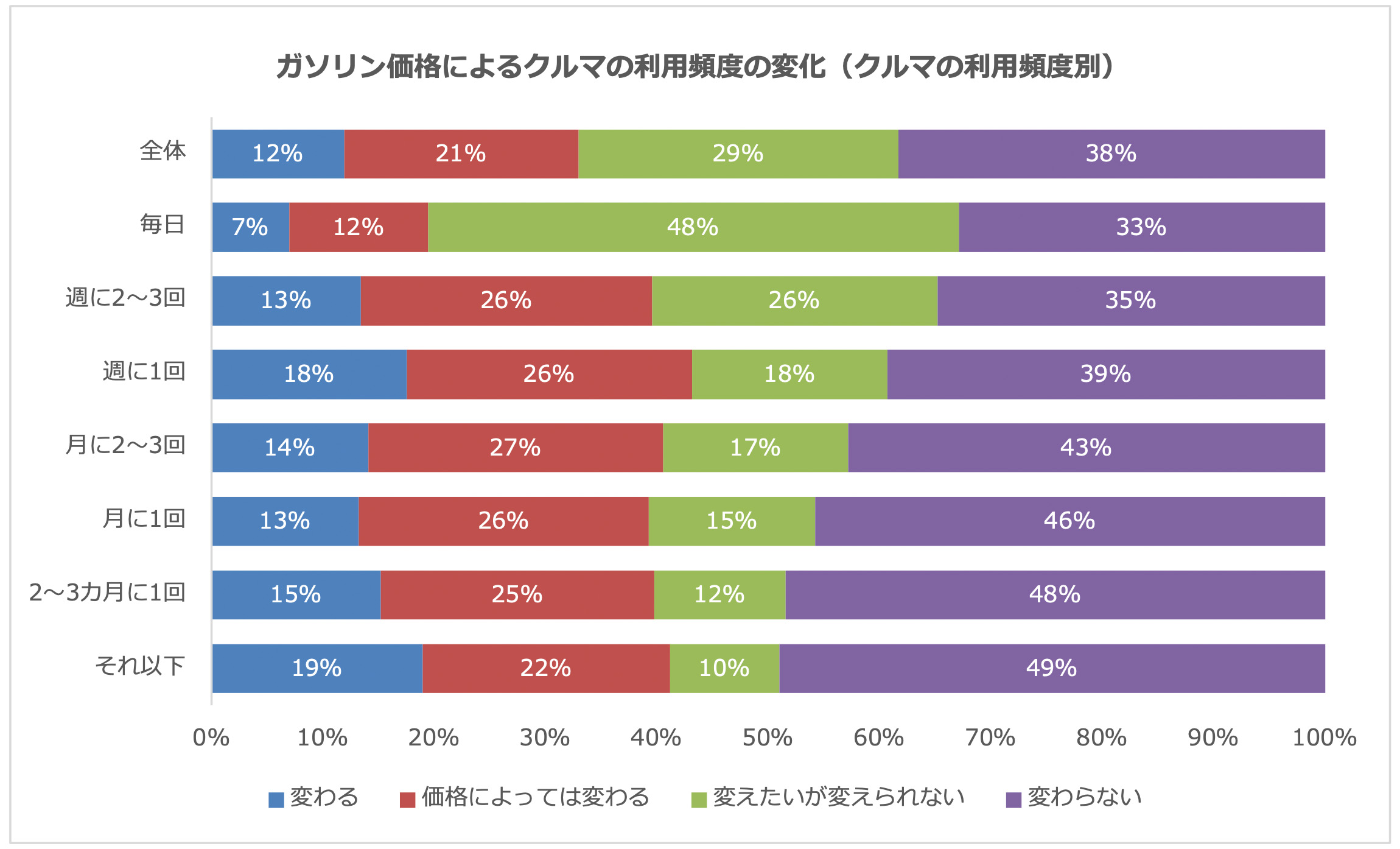 クルマの利用頻度がガソリン価格によって変わるかを尋ねたところ、「変わる」が12%、「価格によっては変わる」が21%、「変えたいが変えられない」が29%、「変わらない」が38%という結果となった。利用頻度別に見ると、毎日クルマを利用する人は48%が「変えたいが変えられない」、33%が「変わらない」と回答している一方、月に1回以下の利用者では「変わらない」が約半数を占めた。