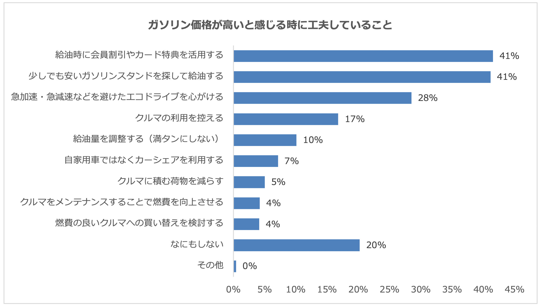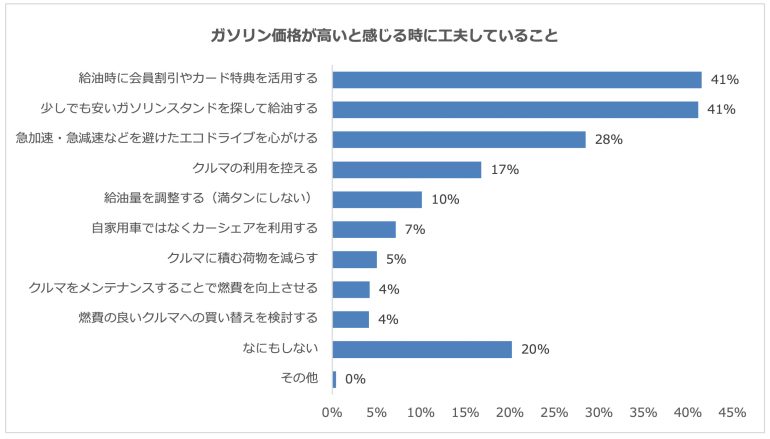 ガソリン価格が高いと感じる時に工夫していることを尋ねると、「給油時に会員割引やカード特典を活用する」「少しでも安いガソリンスタンドを探して給油する」がともに41%で最も多く、多くの人が給油料金の節約に取り組んでいることがわかった。続いて、「急加速・急減速などを避けたエコドライブを心がける」が28%となり、燃費改善による対策を取る人も一定数見られた。