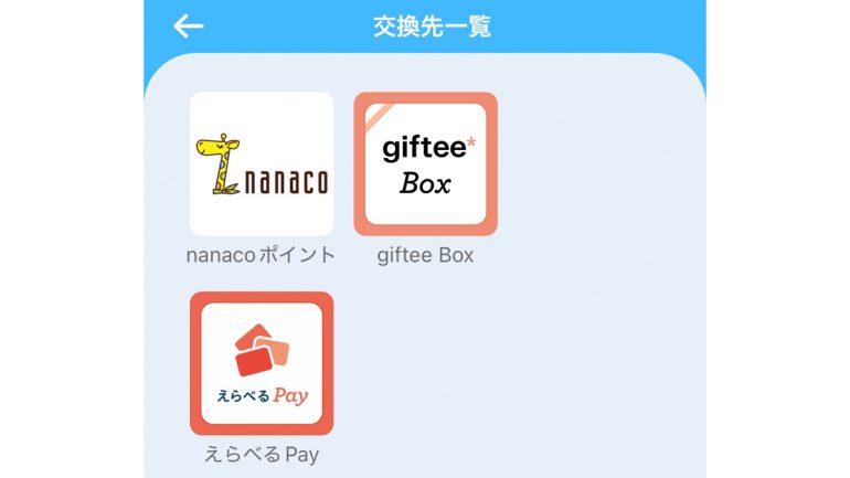 貯まったギバースポイントはnanacoポイントやえらべるPay、giftee Boxに交換できます。えらべるPayとgiftee Boxは10%の手数料が上乗せされてしまうので、交換するなら手数料無料のnanacoポイントがいいと思います。