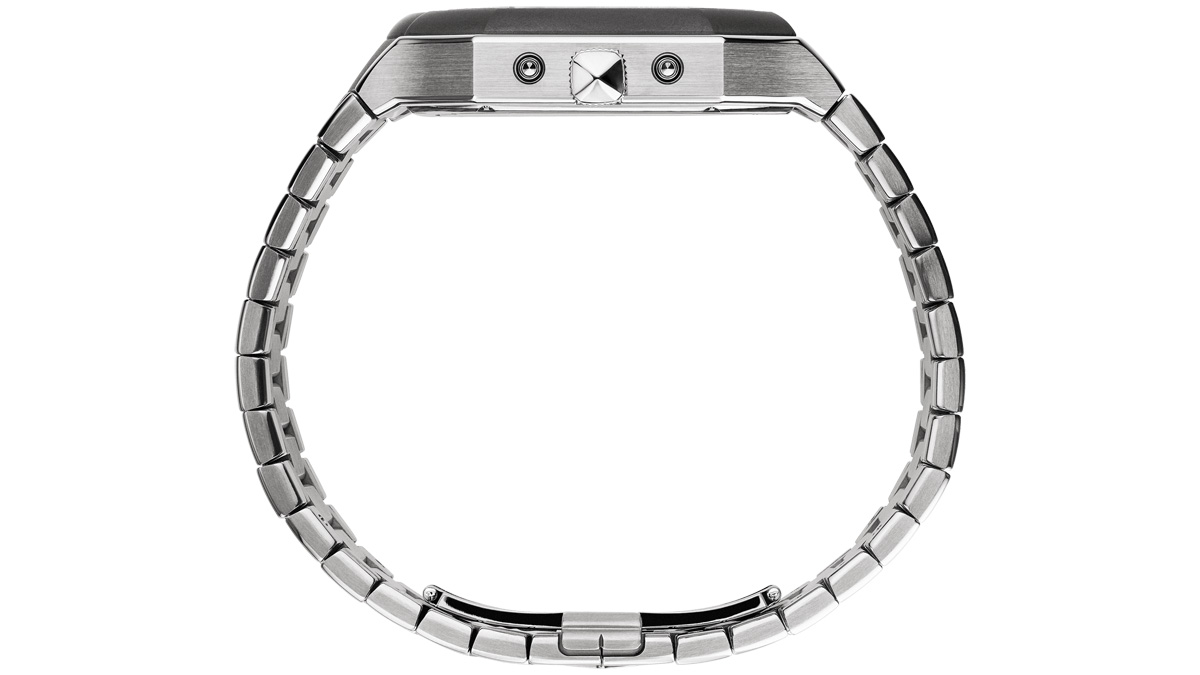 ブレスレット: ジェラルド・チャールズによる完全自社開発の独自設計、グレード5チタン、151個の部品、ブレスレットの微調整を可能にするマイクロリンク、3種類の仕上げ(ダークブラスト、ポリッシュ、縦方向ブラッシュ)、GC刻印入りフォールディングクラスプ(隠しプッシャー付きディプロワイヤント)、エルゴンテック設計