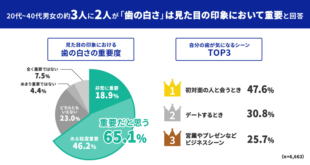 特に自分の歯が気になるシーンとして「初対面の人と会うとき」と回答した人は約半数(47.6%)にのぼり、次いで「デートするとき(30.8%)」・「営業やプレゼンなどビジネスシーン(25.7%)」が続き、ビジネスや対人関係における「歯の見た目」への意識の高さが浮き彫りに。