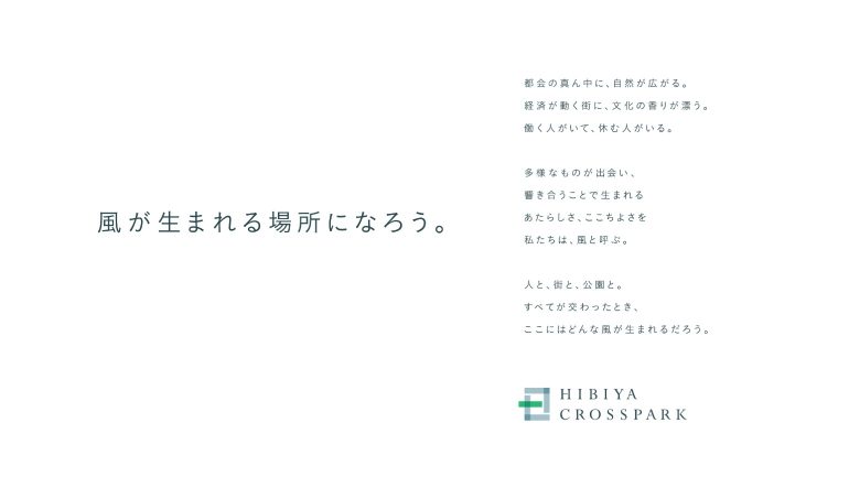 「HIBIYA CROSSPARK」から生まれるさまざまな「風」を、当街区のコンセプトを体現するロゴマークを軸に、アニメーションを用いて視覚的に表現。「HIBIYA CROSSPARK」の世界観を伝えるこのシンボリックなムービーを通して、この街が完成する未来への期待感を醸成していく。