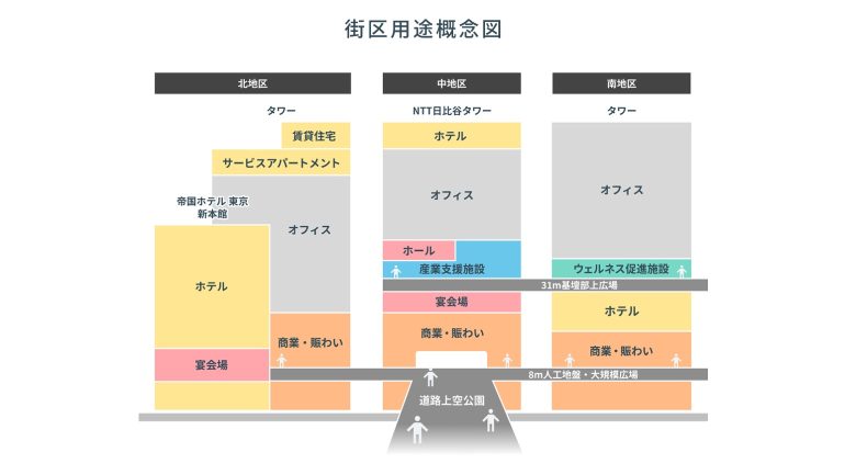 当街区は、事業構想「TOKYO CROSS PARK構想」に基づき、周辺の駅や都心主要拠点、そして隣接する日比谷公園を結ぶ“結節点”として、次のような価値が生まれる街をめざす。