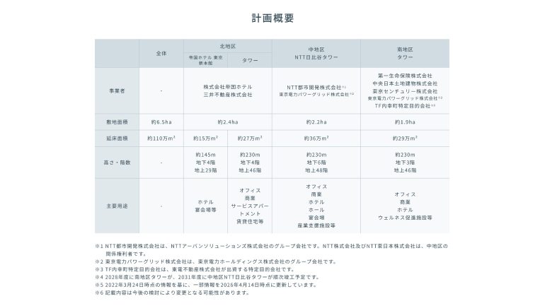 本プロジェクトは北地区・中地区・南地区の3地区で構成されており、オフィス、商業、ホテルなどの多様な用途に対応する、都心最大級延床面積約110万平方mの大規模複合開発だ。全体完成に向けて2028年度に南地区のタワー、2031年度に中地区のNTT日比谷タワーが順次竣工する予定となっている。
