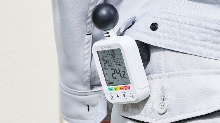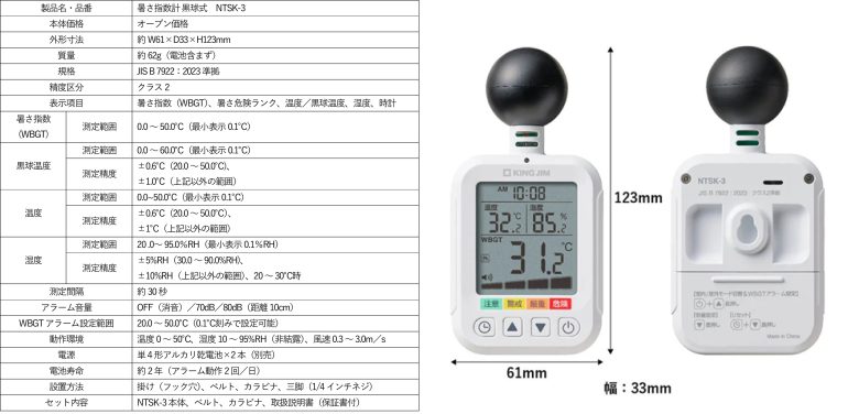 「暑さ指数計 黒球式」は、JIS B 7922:2023 クラス2に準拠した暑さ指数計で、暑さ指数(WBGT)、暑さ危険ランク、温度/黒球温度、湿度、時計を表示。太陽光や地面からの照り返しなど、人体が実際に感じる暑さに近い輻射熱の影響を含めて測定できる黒球式を採用しており、一般的な温度・湿度計算式による暑さ指数と異なり、屋外作業や直射日光下でのリスクをより実態に近い数値として把握可能だ。