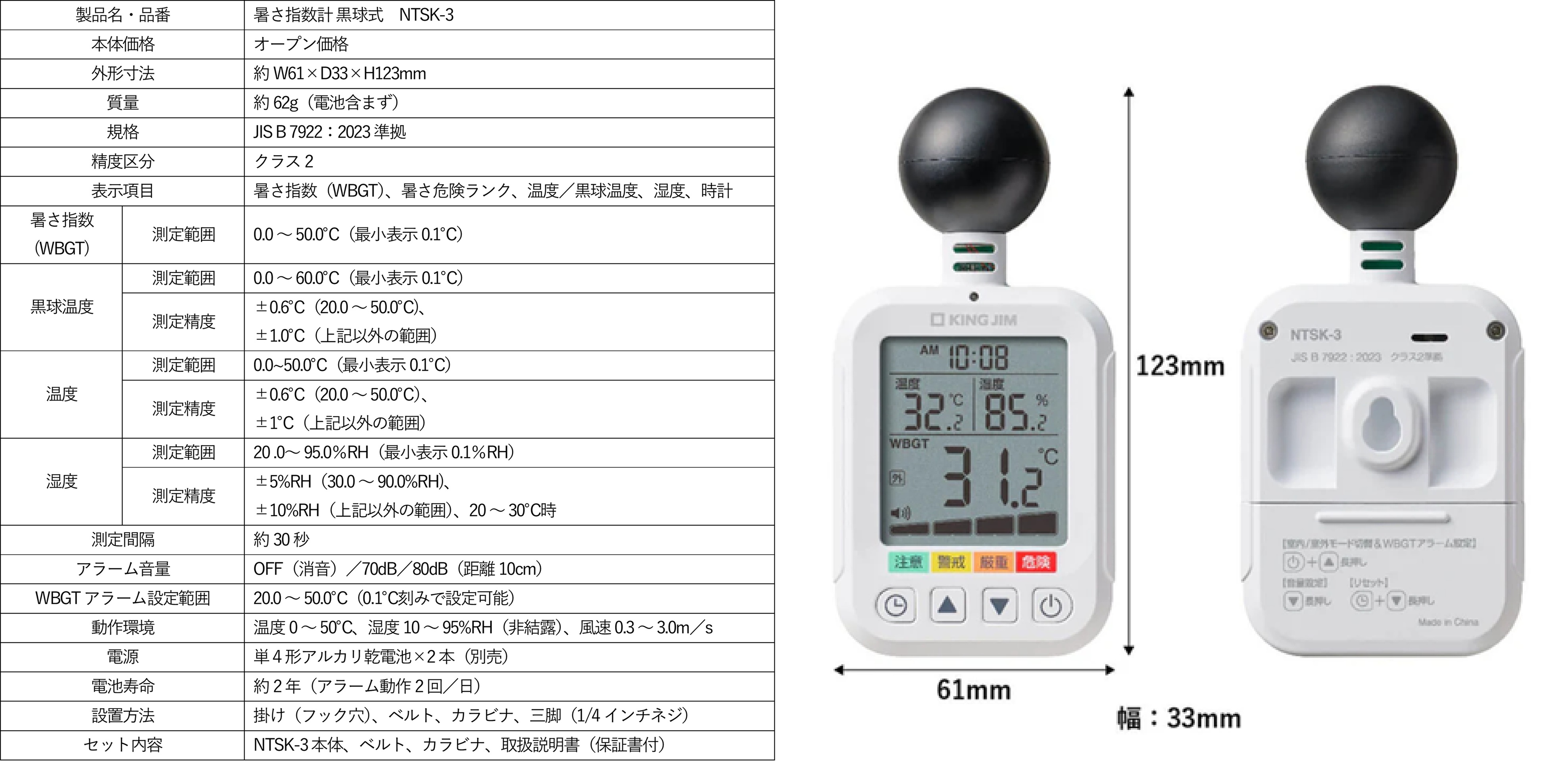 2025年の熱中症による救急搬送人員が過去最多の約10万人となったこと(※)や、同年6月に改正労働安全衛生規則が施行され、一定の作業環境下において熱中症対策が義務化されたことなどを背景に、職場や作業現場における暑さ対策への意識が高まっている。このような背景を踏まえ、キングジムは「暑さ指数計 黒球式」を発売する。