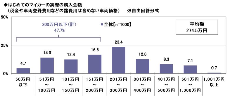 はじめてのマイカーの実際の購入金額 平均は274.5万円、予算より17.0万円高い結果に
