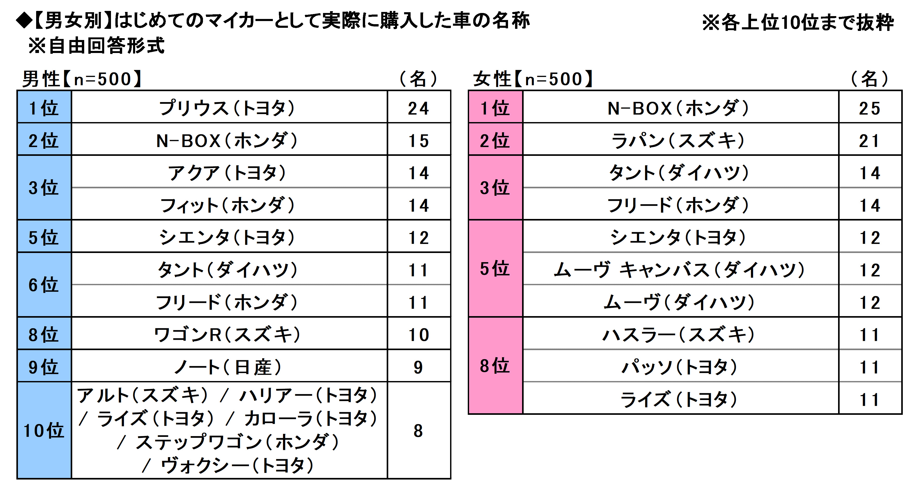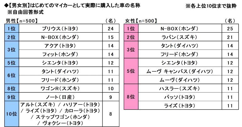 男女別にみると、男性では「プリウス(トヨタ)」(24名)が1位となり、以降、2位「N-BOX(ホンダ)」(15名)、3位「アクア(トヨタ)」「フィット(ホンダ)」(いずれも14名)、5位「シエンタ(トヨタ)」(12名)でした。他方、女性では「N-BOX(ホンダ)」(25名)が1位となり、2位「ラパン(スズキ)」(21名)、3位「タント(ダイハツ)」「フリード(ホンダ)」(いずれも14名)、5位「シエンタ(トヨタ)」「ムーヴ キャンバス(ダイハツ)」「ムーヴ(ダイハツ)」(いずれも12名)と続いた。