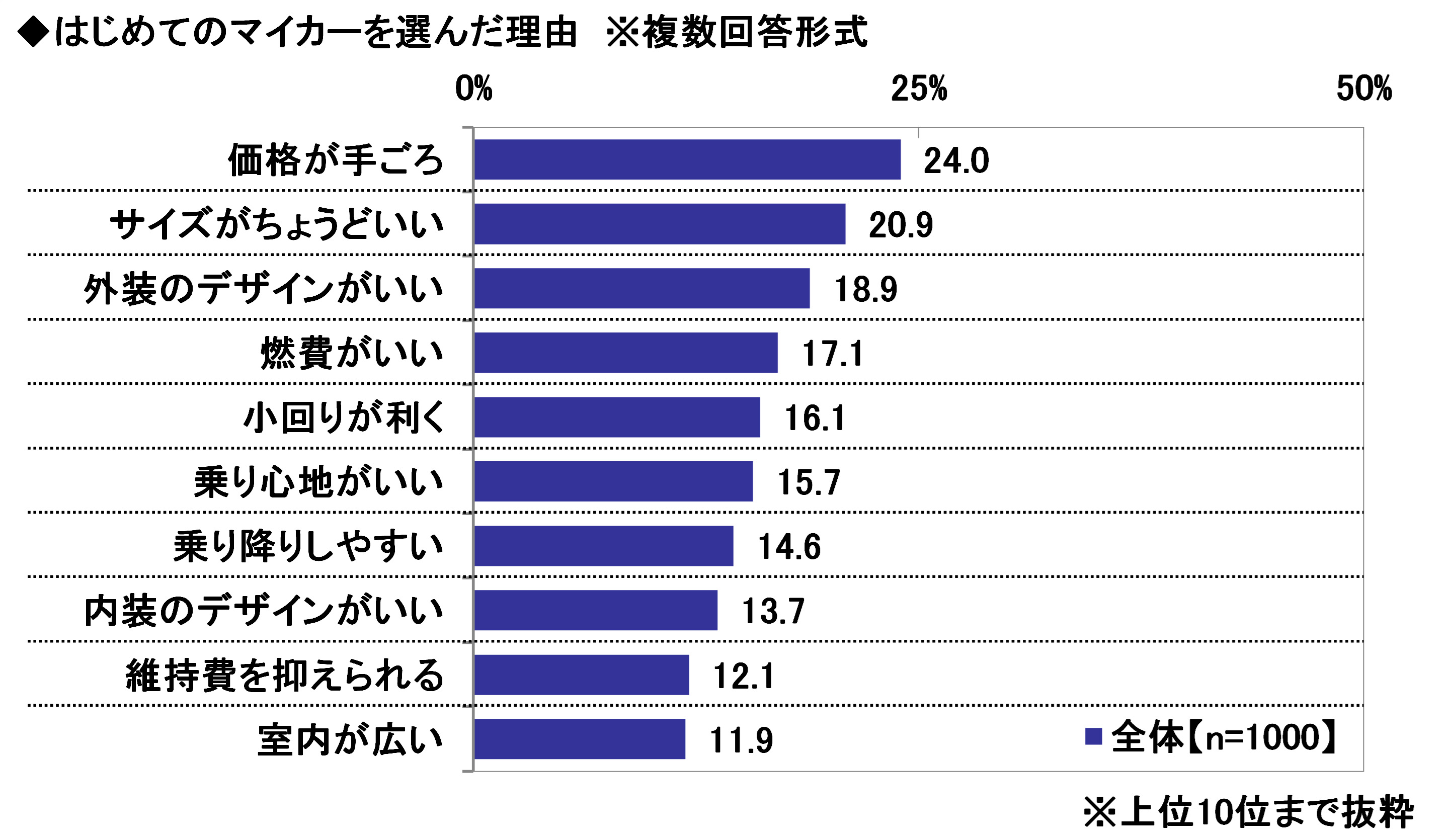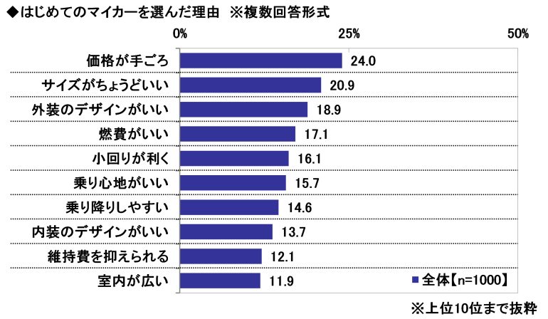 続いて、はじめてのマイカーを選んだ理由を聞いたところ、1位「価格が手ごろ」(24.0%)、2位「サイズがちょうどいい」(20.9%)、3位「外装のデザインがいい」(18.9%)となった。