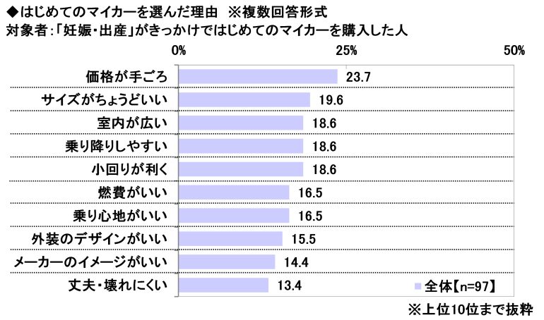 ここで、「妊娠・出産」がきっかけではじめてのマイカーを購入した人(97名)の回答をみると、1位は「価格が手ごろ」(23.7%)、2位は「サイズがちょうどいい」(19.6%)、3位は「室内が広い」「乗り降りしやすい」「小回りが利く」(いずれも18.6%)で、「室内が広い」は全体と比べて6.7ポイント高くなった。室内の快適さや、ベビーシート、チャイルドシートのための十分なスペースなどを重視した人が多いのではないだろうか。