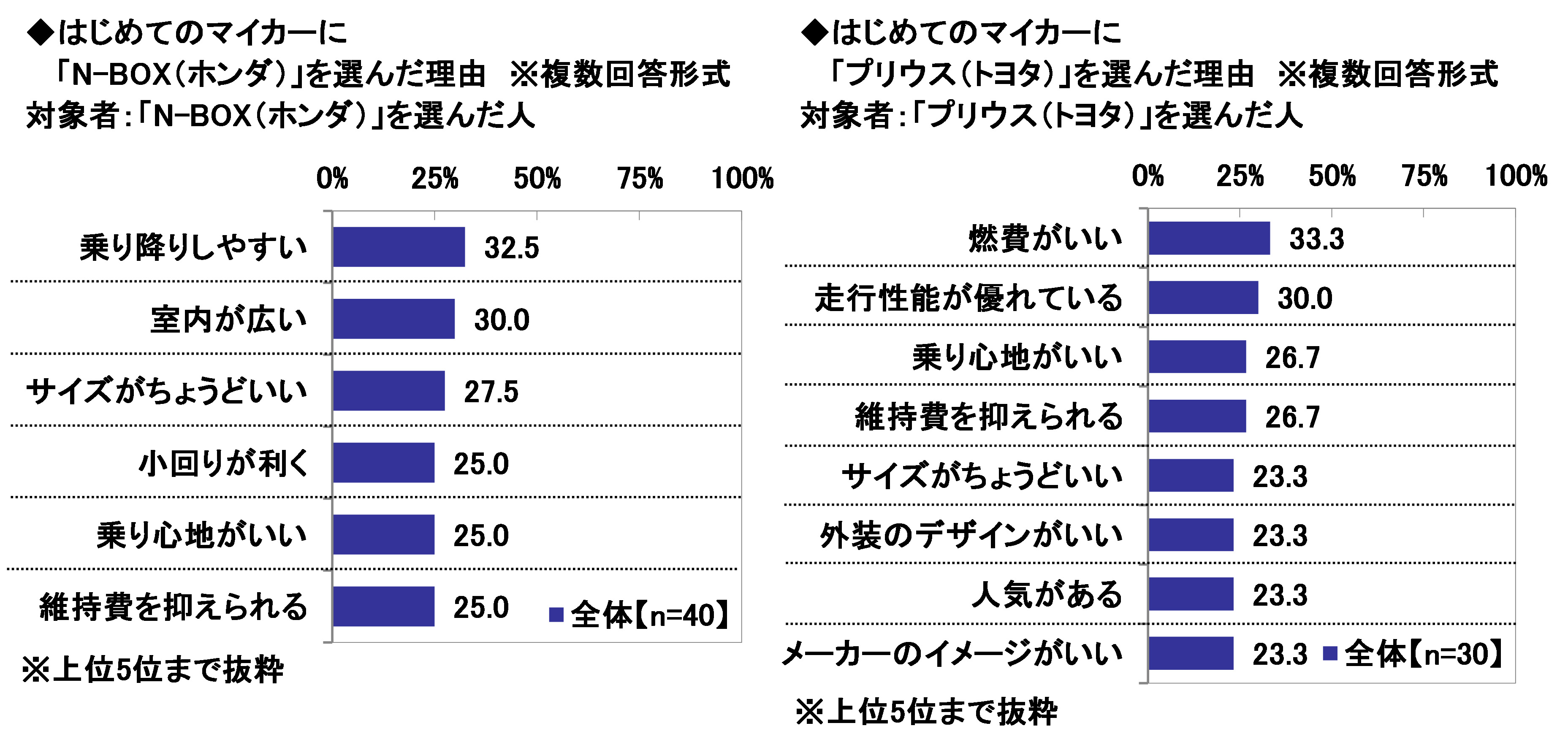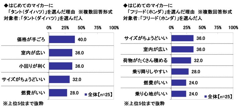 はじめてのマイカーとして実際に購入した車別にみると、「N-BOX(ホンダ)」では1位「乗り降りしやすい」(32.5%)、2位「室内が広い」(30.0%)、「プリウス(トヨタ)」では1位「燃費がいい」(33.3%)、2位「走行性能が優れている」(30.0%)となった。