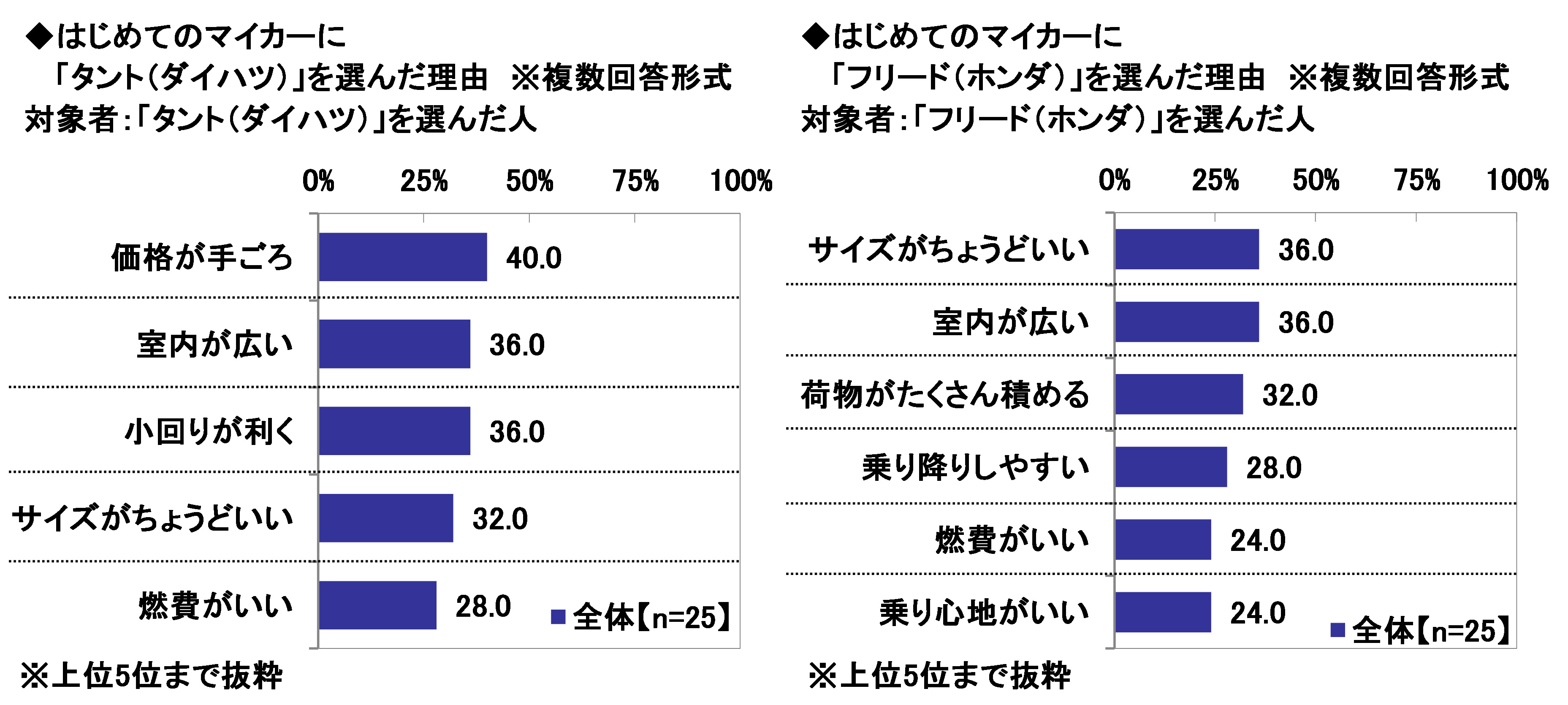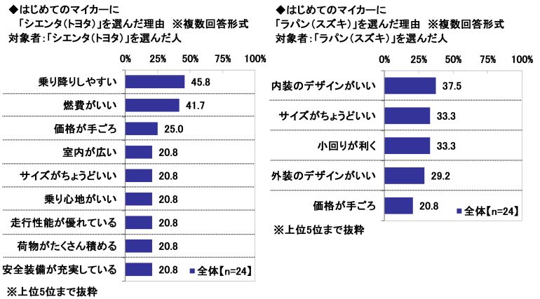 また、「タント(ダイハツ)」では「価格が手ごろ」(40.0%)、「フリード(ホンダ)」では「サイズがちょうどいい」「室内が広い」(いずれも36.0%)、「シエンタ(トヨタ)」では「乗り降りしやすい」(45.8%)、「ラパン(スズキ)」では「内装のデザインがいい」(37.5%)が最も多くなった。