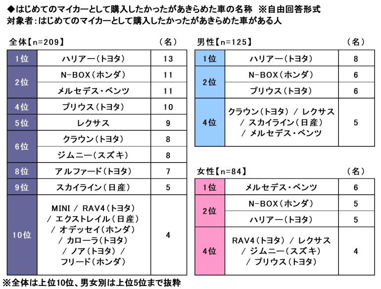 はじめてのマイカーとして購入したかったがあきらめた車がある方209名に、購入をあきらめた車の名称を聞いたところ、1位「ハリアー(トヨタ)」(13名)、2位「N-BOX(ホンダ)」「メルセデス・ベンツ」(いずれも11名)、4位「プリウス(トヨタ)」(10名)、5位「レクサス」(9名)となった。