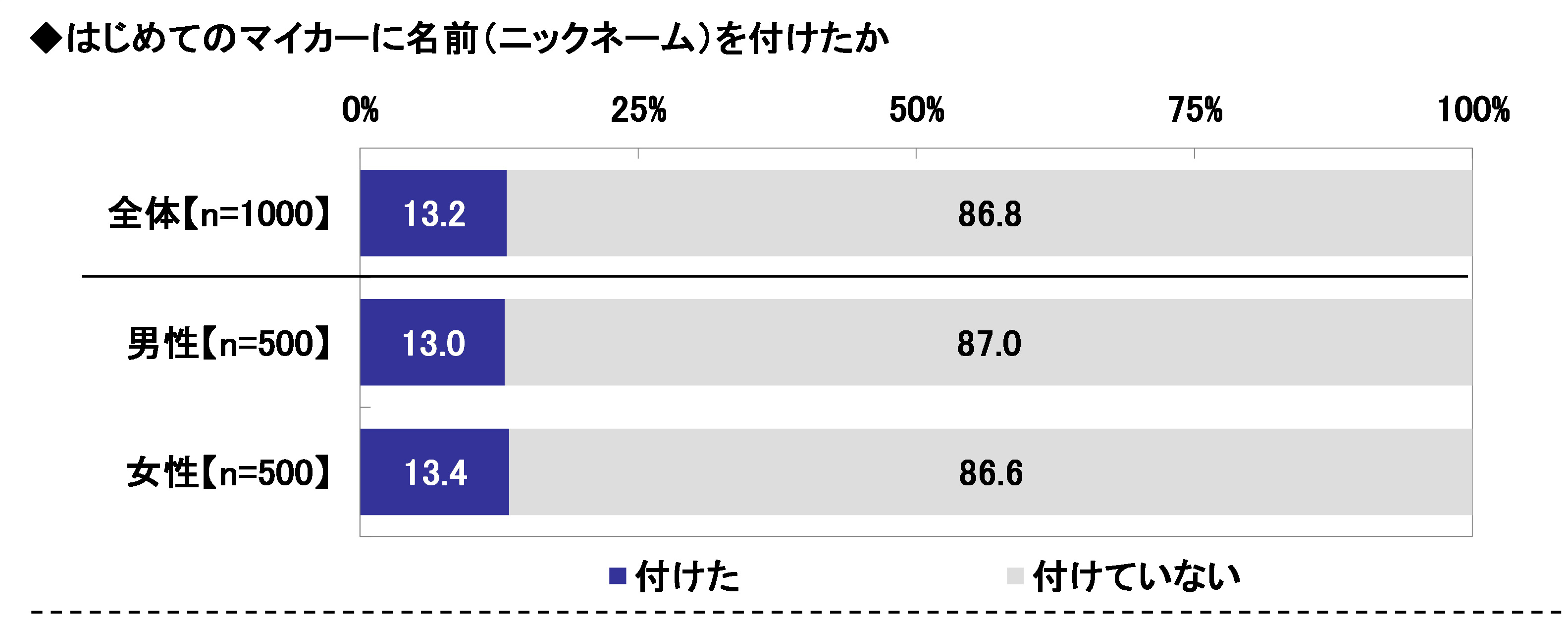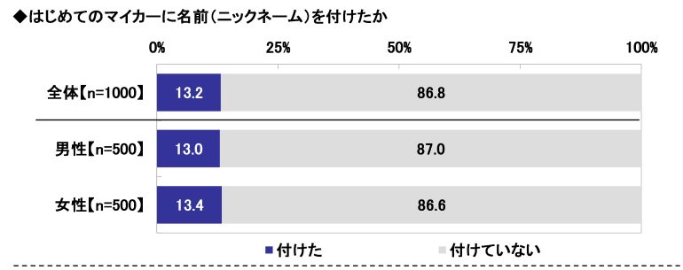はじめてのマイカーに名前(ニックネーム)を付けたかどうかを聞いたところ、「付けた」は13.2%、「付けていない」は86.8%となった。