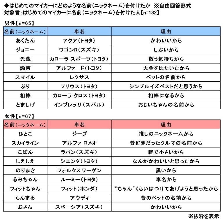 「はじめてのマイカーにニックネームを付けた」が13.2%、付けたニックネームは「あくたん」「先輩」「ひとこ」「のりまき」など