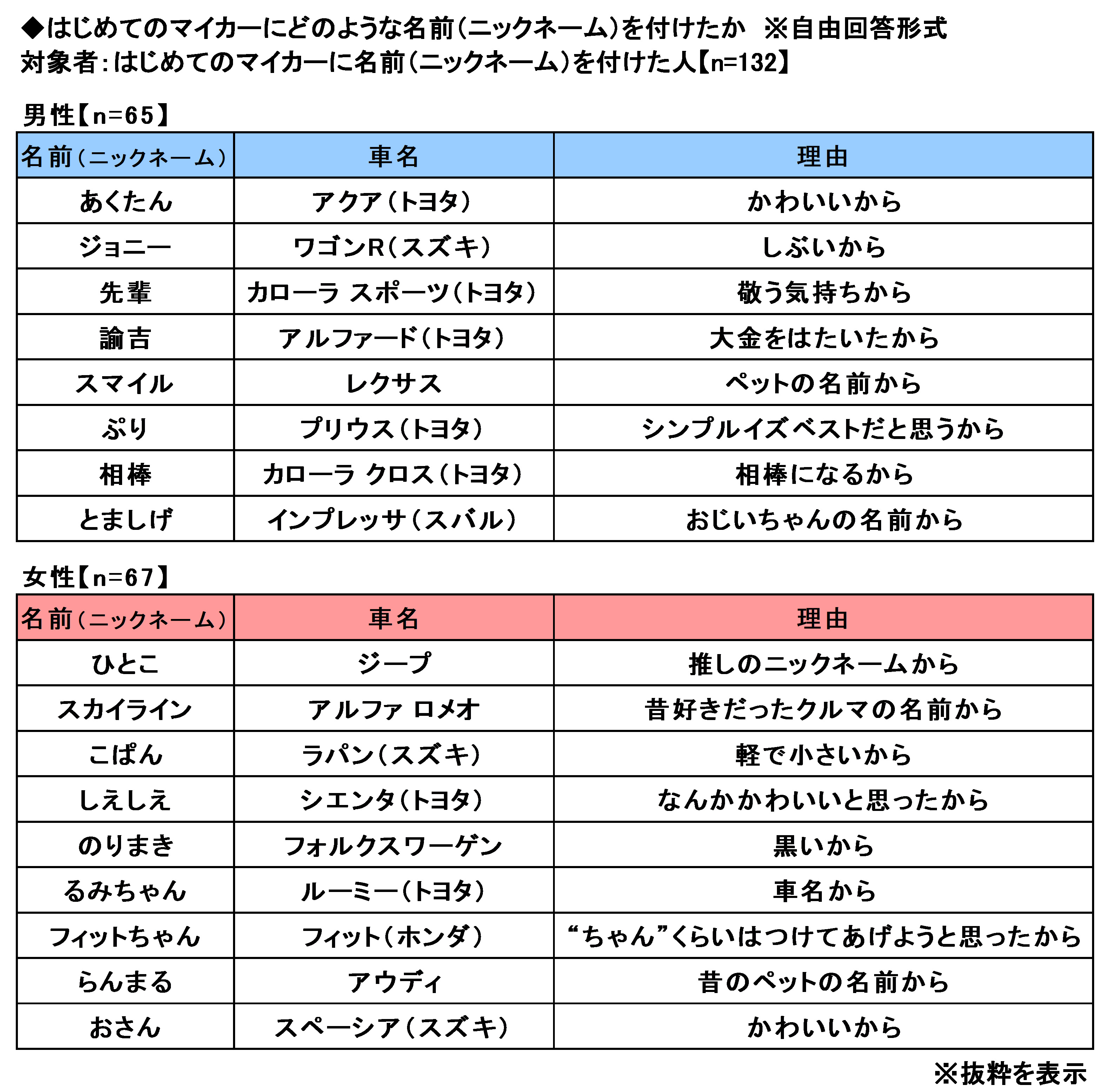 はじめてのマイカーに名前(ニックネーム)を付けた方132名に、付けた名前(ニックネーム)とその理由を聞いたところ、男性回答では「あくたん」(アクア・トヨタ、かわいいから)、「ジョニー」(ワゴンR・スズキ、しぶいから)、「先輩」(カローラ スポーツ・トヨタ、敬う気持ちから)、「スマイル」(レクサス、ペットの名前から)、「とましげ」(インプレッサ・スバル、おじいちゃんの名前から)、女性回答では「ひとこ」(ジープ、推しのニックネームから)、「こぱん」(ラパン・スズキ、軽で小さいから)、「のりまき」(フォルクスワーゲン、黒いから)、「フィットちゃん」(フィット・ホンダ、“ちゃん”くらいはつけてあげようと思ったから)、「らんまる」(アウディ、昔のペットの名前から)といった回答が挙げられた。(図13)