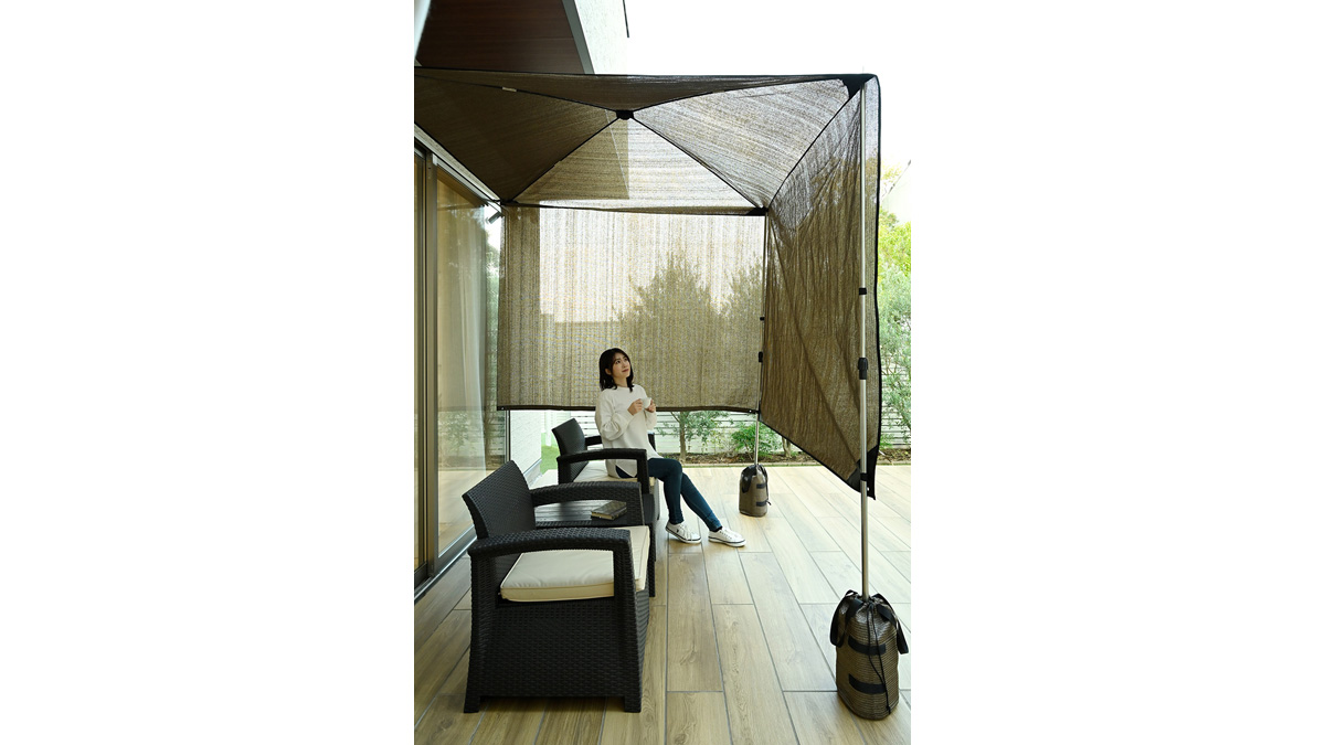 今回発売する「リビングシェード」は、暑さ対策として日差しを遮りつつ、風を通しやすい生地を採用することで、屋外でも涼やかに過ごせる環境をつくる。