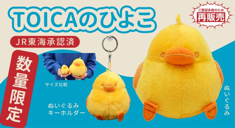 アサミズカンパニーは、JR東海承認済のTOICAのひよこ ぬいぐるみ、ぬいぐるみキーホルダーを数量限定で再販売を開始した。