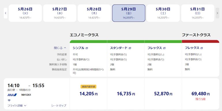 「フレックス」は5万2,870円、「スタンダード」は1万6,753円、そして「シンプル」は1万4,205円。「スタンダード」と「シンプル」の価格差は2,500円といったところだ。復路も同額だった場合、「シンプル」にすれば往復で5,000円セーブできるのだが……これを単純に「お得」と解釈してもいいのだろうか?