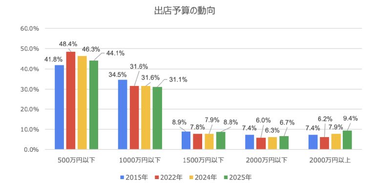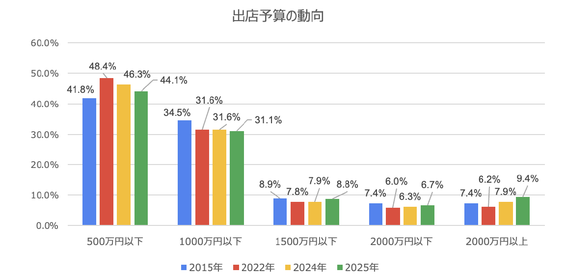 出店予算の分布では、前回調査の2024年と比較して「500万円以下」の割合は2.2ポイント減少して44.1%だったが、「1500万円以下」、「2000万円以下」、「2000万円以上」はいずれもわずかに増加している。一定の投資を伴う出店を検討する動きは増加傾向だが、コストを抑えた出店を志向する層も引き続き存在している。出店予算の考え方が二極化しているといえる。近年は、資材価格や建築費の高騰が続いており、同規模の店舗でも必要となる出店予算が上昇している可能性もあり、それが出店予算を引き上げている可能性もありそうだ。