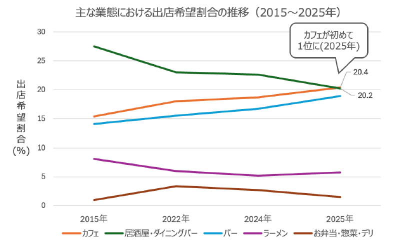 過去10年の推移では、「カフェ」の出店希望割合は2015年の15.4%から2025年には20.4%まで上昇して、緩やかな増加傾向が続いている。それまでトップだった「居酒屋・ダイニングバー」は2015年の27.5%から2025年は20.2%まで減少している。夜業態の「バー」は2015年の14.1%から2025年に18.9%(2025年)まで増加しており、「居酒屋・ダイニングバー」とは違って出店希望が高まっているようだ。減少傾向なのは「ラーメン」だ。2015年の8.1%から2024年には5.2%まで低下しており、2025年は5.8%とやや持ち直したが長期的には出店希望割合が減っている。「お弁当・惣菜・デリ」に関してもコロナ禍の2022年には3.4%まで上昇していたが、2025年には1.5%まで低下しており、テイクアウト系業態のニーズがコロナ収束後に落ち着いてきたと読み取れる。