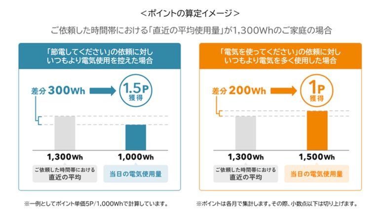 中部電力ミライズが提供する「NACHARGE Link KADEN」へサービス申し込みを行なうと、DR要請に対する電力使用量の変化(直近の平均使用量との差)を貢献量としてポイント化。ポイントは1か月単位で集計、翌月上旬にまとめて進呈される。