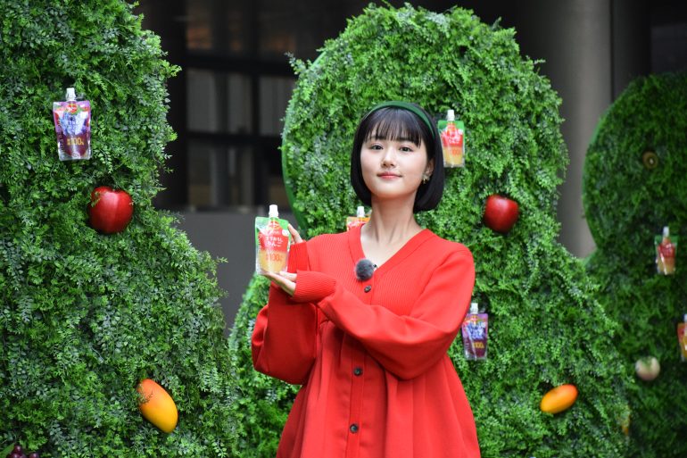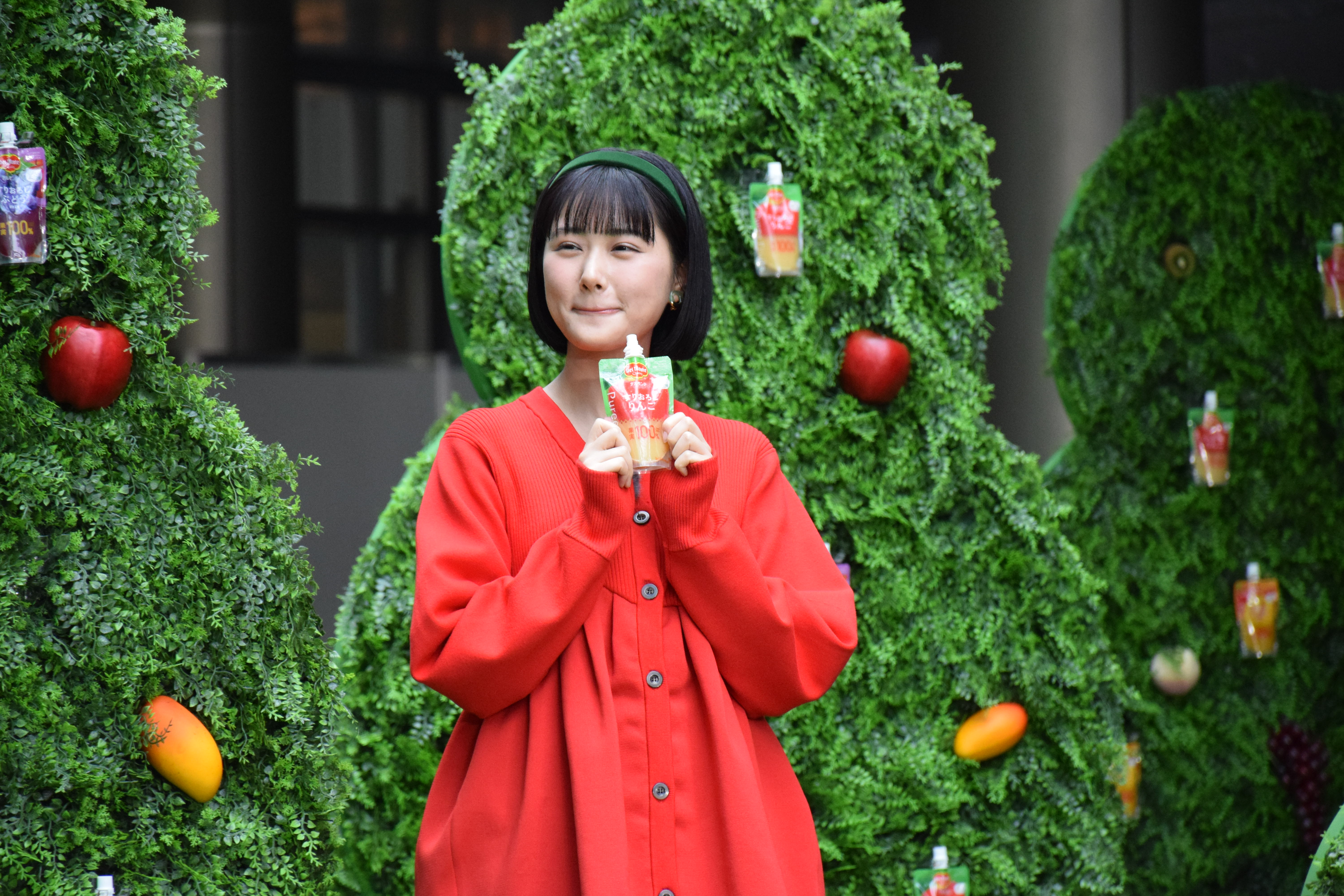 りんごをイメージした真っ赤な衣装で登壇し、原さんが「来場者第1号」として『ピュレフルーツ』を“収穫”した。