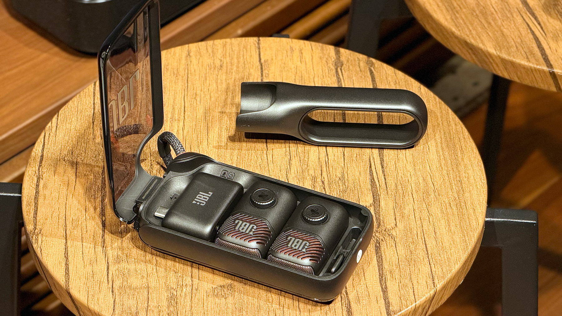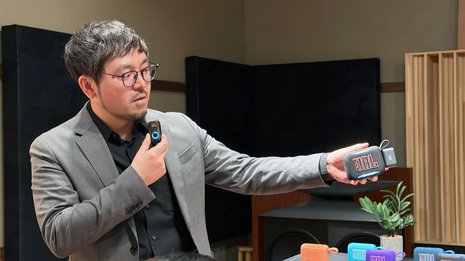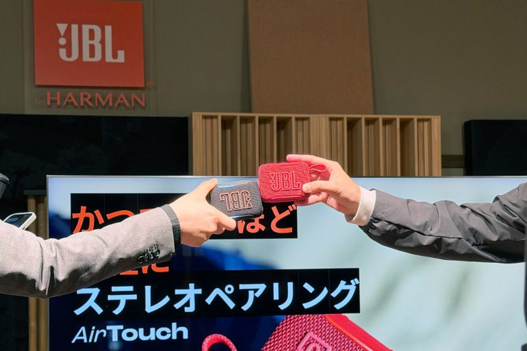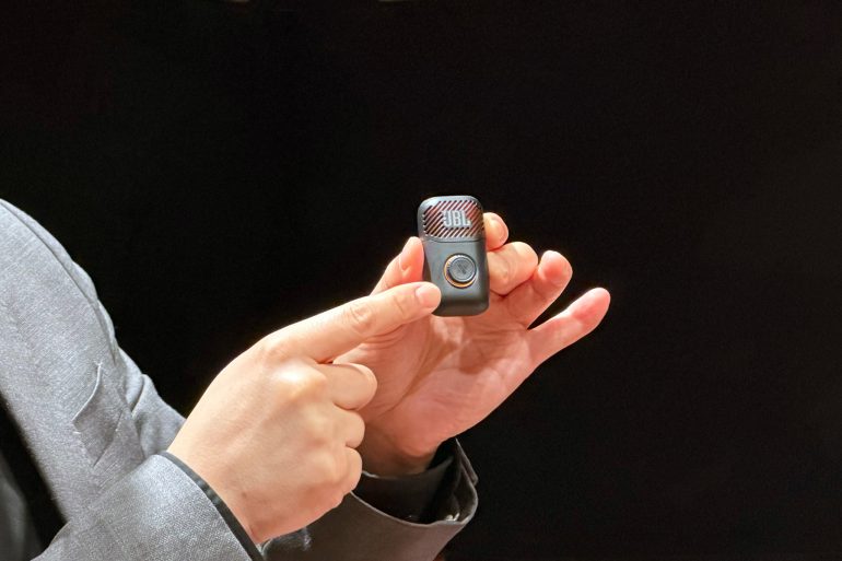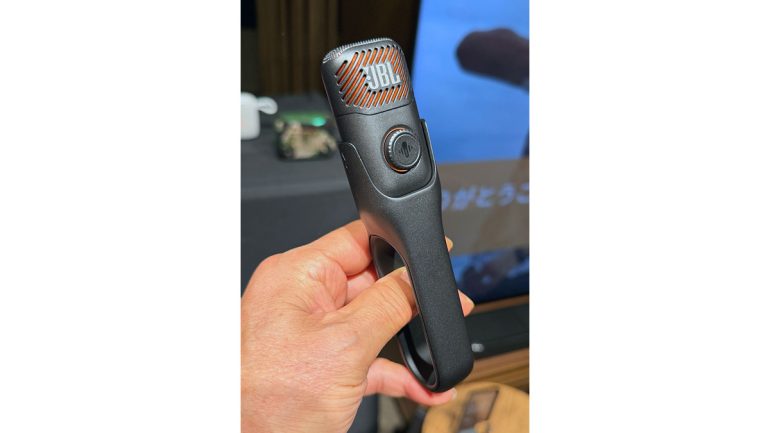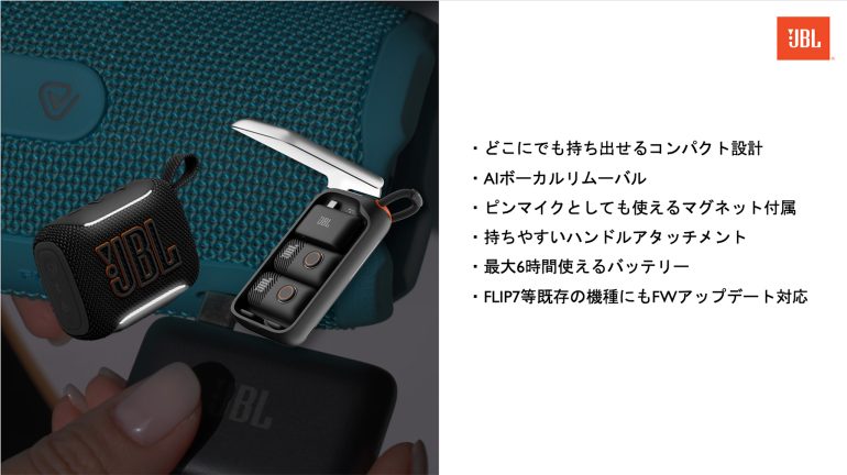 発表会の終盤には、さらなる驚きが待っていた。AI技術を活用し、どんな音源からも瞬時にボーカルを消し去る「Easy Sing Mic(イージー・シング・マイク)」シリーズとの連携である 。ドングルを「GO 5」に挿すだけで、どこでもカラオケやPAシステムに変身するという、JBLらしい遊び心あふれる提案だ。価格は「Easy Sing Mic mini Duo」で約3万円、今夏の発売を予定している。