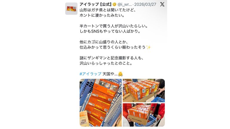 ちなみに先日、公式Xの中の人が「アイラップガチ県」と言われる山形県を初訪問。