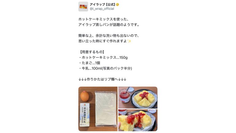 つい最近も、SNSで蒸しパンが話題になっていた際に「アイラップ」を使った蒸しパンレシピを投稿したところ、約3万いいねを記録、レシピ内で紹介したアイラップホルダーの売上が約12倍になったという。
