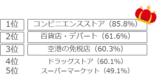 また、買い物をする場所に関する質問(複数回答可)では、免税店やドラッグストアと大きな差をつけてコンビニエンスストアが85.8%と訪れる場所として最も多く挙げられていた。