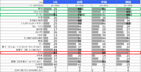 森永製菓が行った「訪日外国人アイス認知度調査(※2)」によると、アイスに関しては韓国以外では過半数が喫食意向を示しており、特にUSと中国ではトップとなっていた。一方で寿司とラーメンは、台湾・韓国ではともに6割以上ではあるものの、USの寿司は35%、中国のラーメンは41%と比較的低いことも明らかになった。