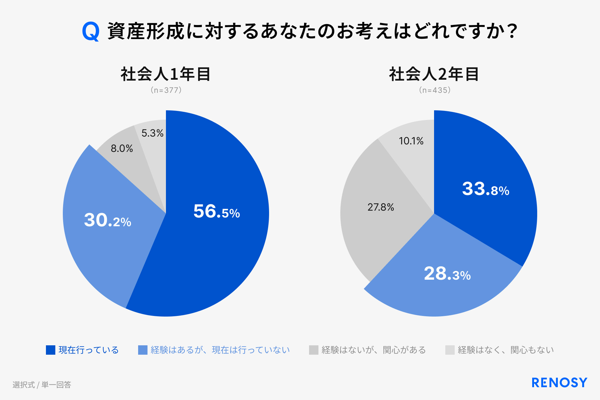 「資産形成に対する考え」を尋ねたところ、資産形成の経験者(現在行っている・経験はあるが、現在は行っていない)は、社会人1年目で86.7%、2年目で62.1%に達した。これに関心層を加えると、社会人1年目は94.7%、2年目は89.9%となり、社会人1年目と2年目の9割が投資に関心を持っていることがわかる。