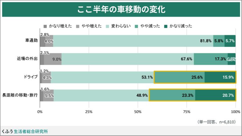 「ドライブ」「長距離の車移動」は4割以上の人が「減った」と実感
