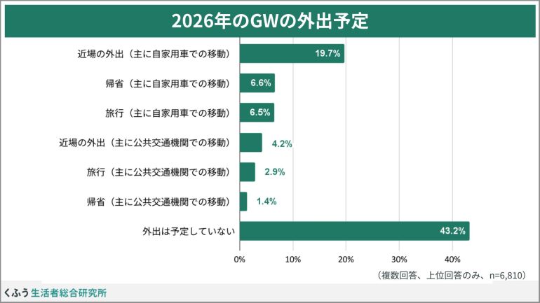 2026年のゴールデンウィークは5月3日~6日が4連休、前後の平日を休めば8~12連休、さらに条件がそろえば16連休という休みの取りやすさが話題だが、調査時点で外出を予定している人はあまり多くなく、最も多いのが「自家用車で近場の外出」(19.7%)だった。自家用車での帰省や旅行はどちらも約6%に留まっている。約4割が「外出の予定なし」と回答した。