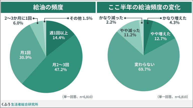 給油については「月2~3回」(47.2%)が最も多く、次いで「月1回」(30.9%)が多い結果となった。給油頻度はここ半年では目立つ増減はなかった。
