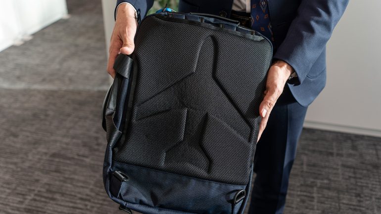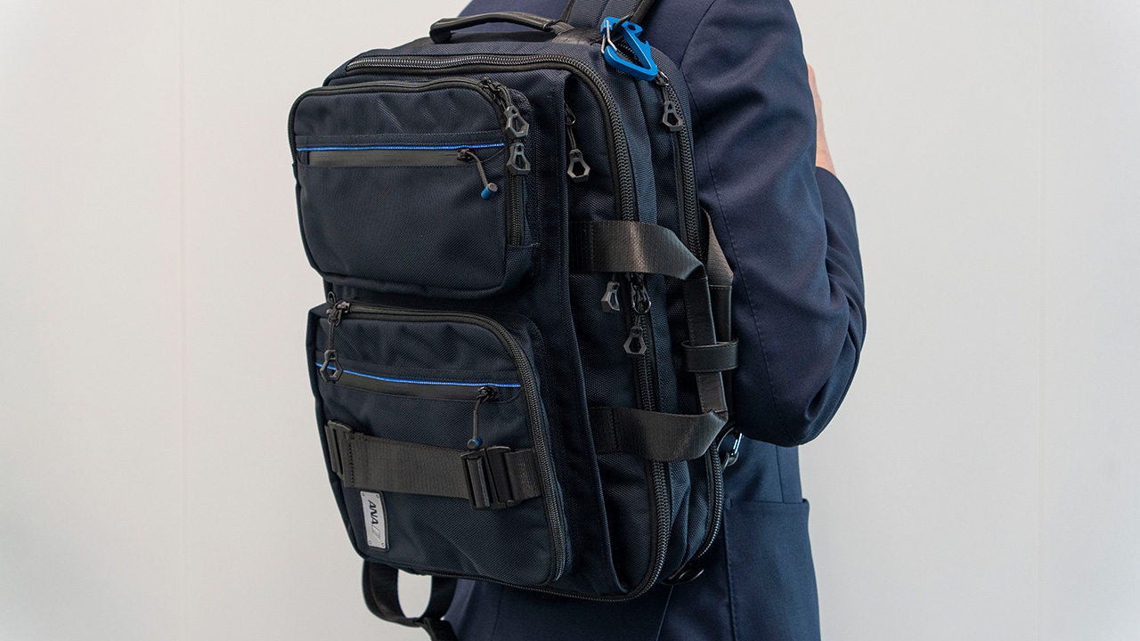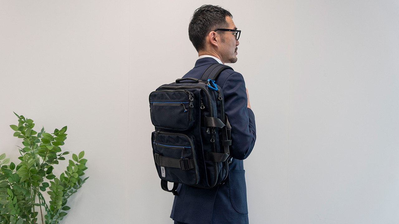 特に自分好みにカスタマイズが楽しめるアイテムが「タフなビジネス3wayバッグ」。ショルダー、リュック、トートと使うことができ、通勤時はリュック、商談に行く時はトート、と使い分けることができる。さらに飛行機のシートベルトをイメージした正面の多機能ベルトは取り外しが可能。付属のガジェットポーチを取っ手につけたり、ジャケットをかけたりと、自由自在だ。