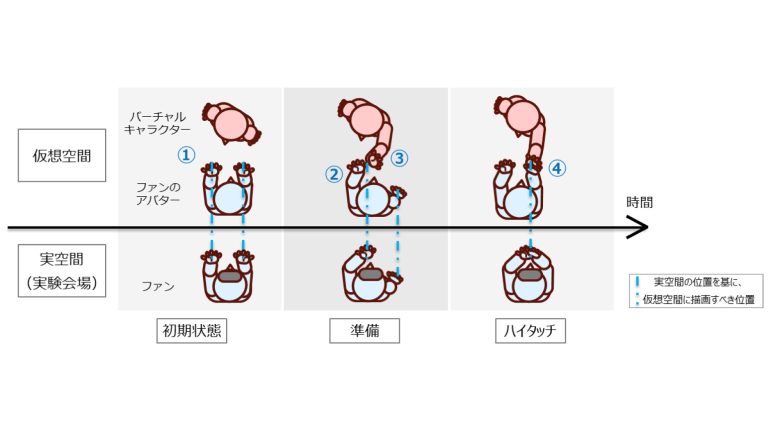 (4) 実空間でファンが両手を重ねると、仮想空間でバーチャルキャラクターとハイタッチ可能