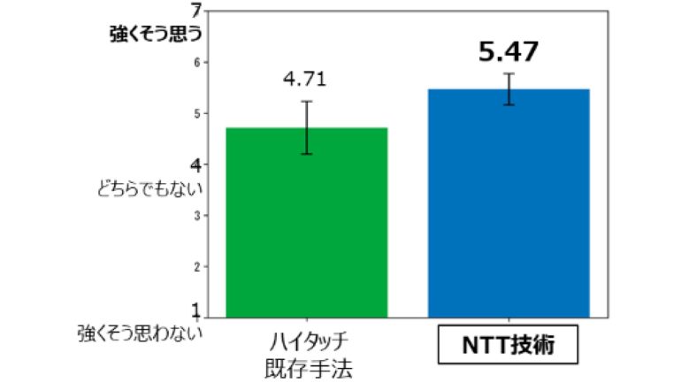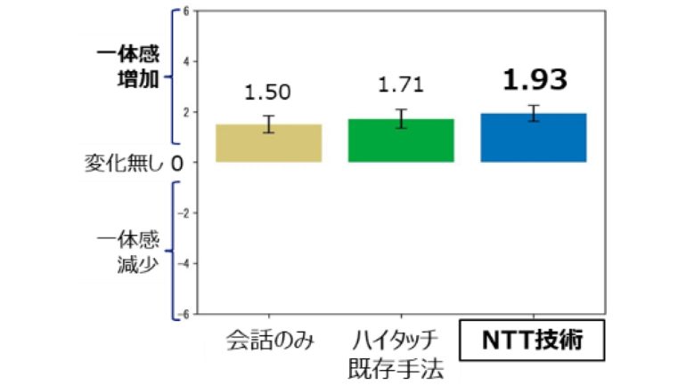 VRファンミーティング実験参加者(計39名)を対象に実施したアンケートの結果、NTTの技術について、「ハイタッチをした感覚」や「バーチャルキャラクターとの一体感」などの項目において高い評価が得られた。