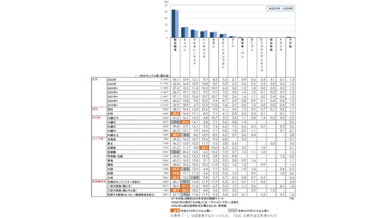 直近で購入した中古車のボディタイプは、「軽自動車」が43.1%でもっとも高く、2位は「ミニバン」(15.9%)だった。30歳台は「ミニバン」が11.7ポイント、60歳以上は「軽自動車」が5.8ポイント、それぞれ全体と比較して高くなった。