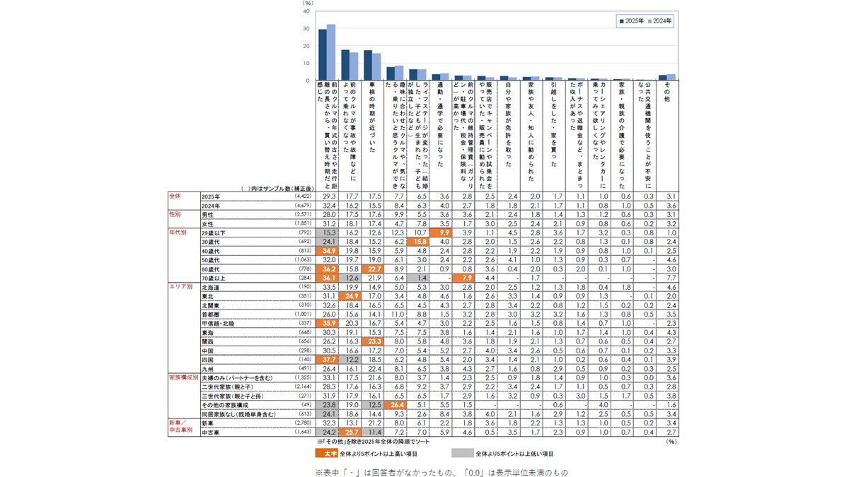 1年以内に新車・中古車のいずれかを購入した人に購入しようと思い立ったもっとも大きいきっかけを質問すると、トップは「前の車の年式の古さや走行距離の長さから買い替え時期だと感じた」(29.3%)だった。新車購入者に関しては、2位は「車検の時期が近づいた」(21.2%)だった。中古車購入者は「前の車が事故や故障などによって乗れなくなった」が25.7%でもっとも高かった。