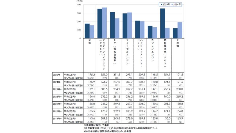 2025年の中古車市場規模(費用総額)は、中古車購入単価×延べ購入台数にて算出すると5兆3194億円と推計されるという。前年より4909億円ほど増加して、2019年の調査以降で最大の市場規模を記録した。ただ1年間の中古車購入率は3.28%で、前年よりも0.07%ほど下がった。中古車購入単価は175.2万円で前年よりも19.3万円ほど上昇しており、2015年の調査以降もっとも高い単価だった。