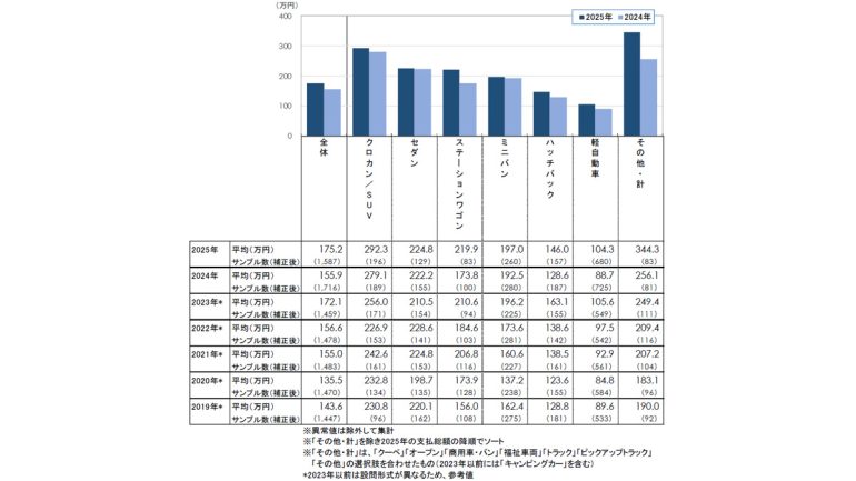車の購入台数は停滞気味と言われているが、中古車市場規模に関しては2025年に過去最大の5兆3194億円を記録したという。この要因は、購入単価の上昇が市場を拡大したことだろう。リクルートの自動車市場に関する調査・研究機関『カーセンサー自動車総研』は、車の購入における消費者の実態を深く把握することを目的に『自動車購入実態調査2025』を実施した。それによれば中古車購入単価は175.2万円で前年よりも19.3万円も上昇していた。