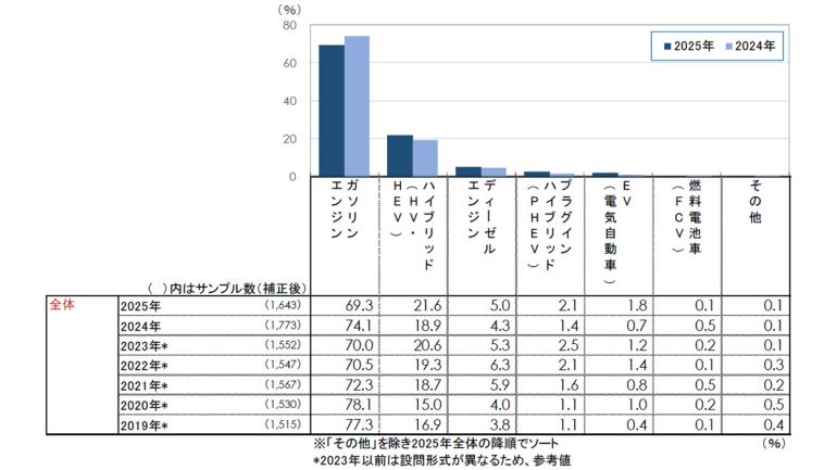 中古車のエンジンタイプは「ハイブリッド」が前年より2.7ポイント増加